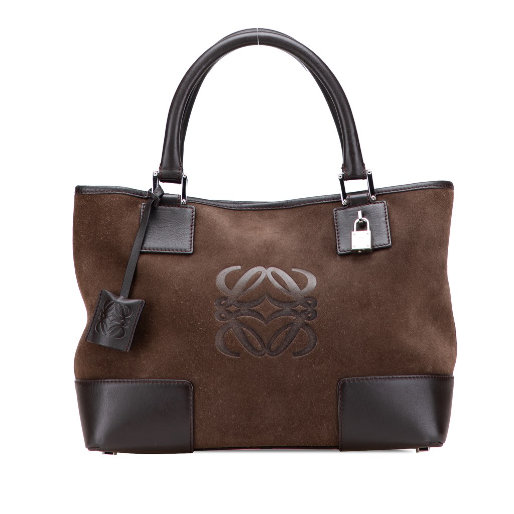 This tote bag features a suede leather body with calf leather trim, rolled leather handles, an open top with magnetic snap closure, and interior zip and slip pockets.
