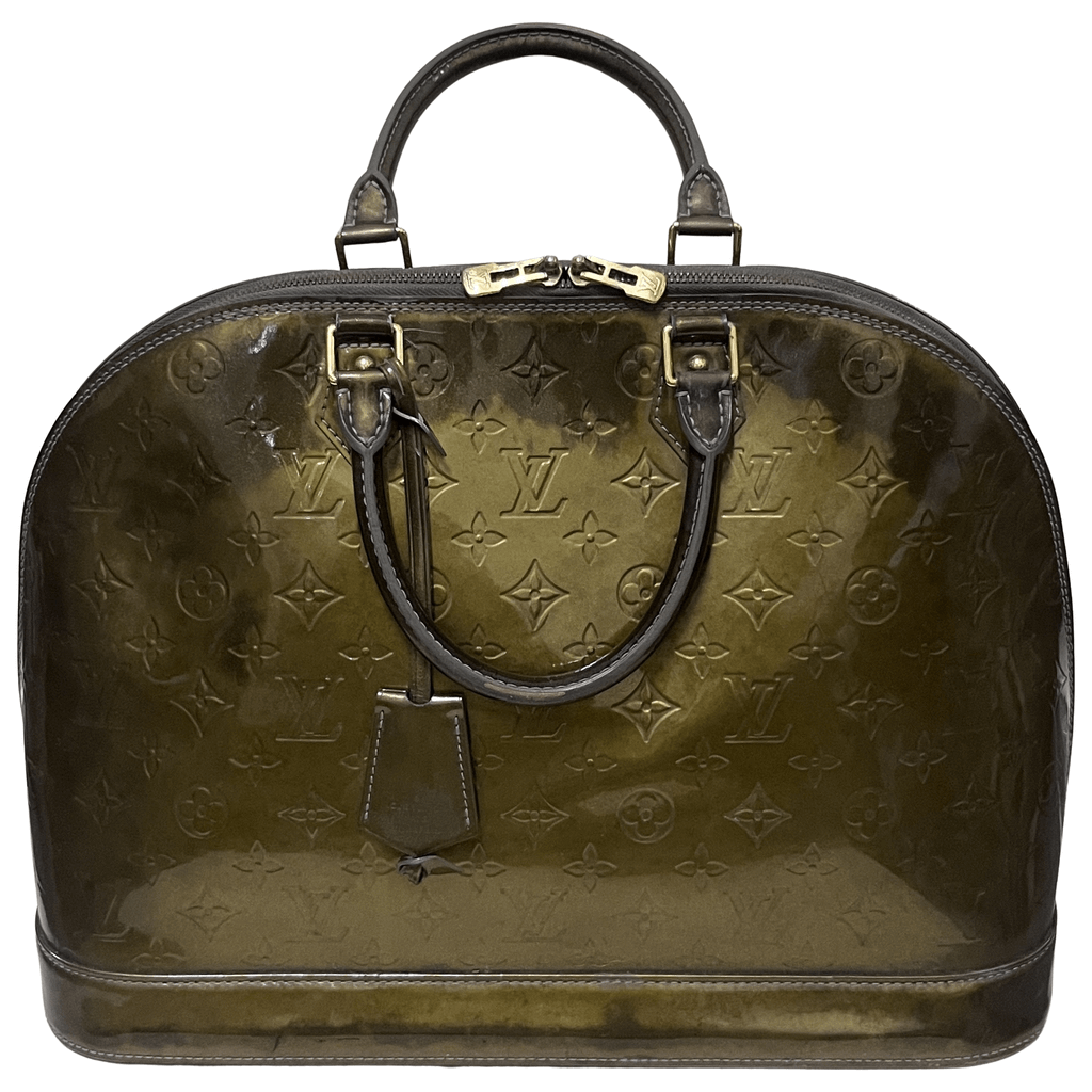 LouisVuittonAlmaGMVertOliveMonogramVernis:•Description: Structured dome-shaped handbag made from olive-green patent (vernis) leather embossed with the LV monogram. It has two rolled top handles, a double zipper, gold-tone hardware, and a padlock.•Size / Measurements: ~ 39 cm (W) 29 cm (H) 19 cm (D)