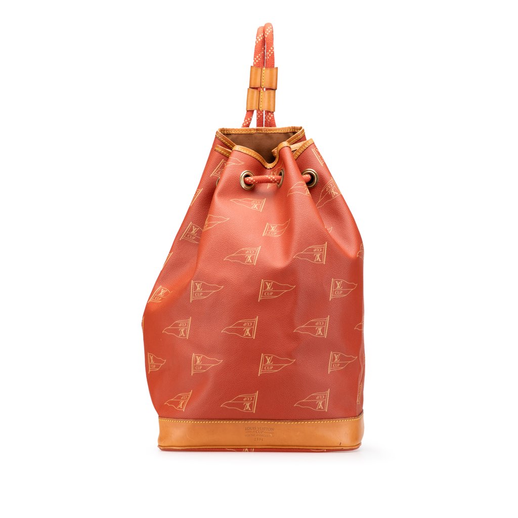 This backpack features a coated canvas body with vachetta leather trim, rolled rope back straps, an open top with a drawstring closure, and an interior zip pocket.