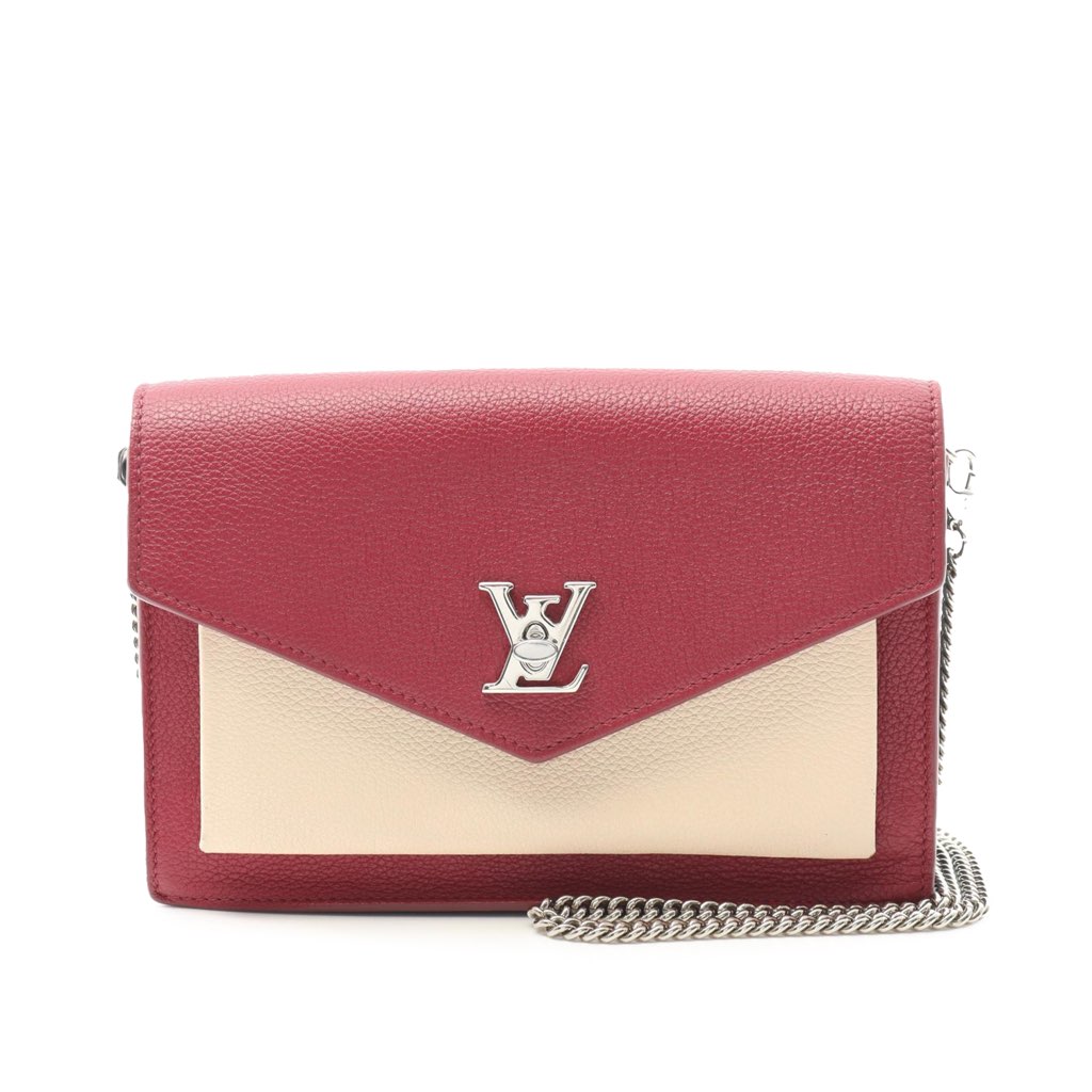 The MyLockMe Pochette features a leather body, a removable silver-tone chain shoulder strap, a front flap with twist lock closure, an exterior front slip pocket, an exterior back slip pocket, and interior zip and slip pockets.
