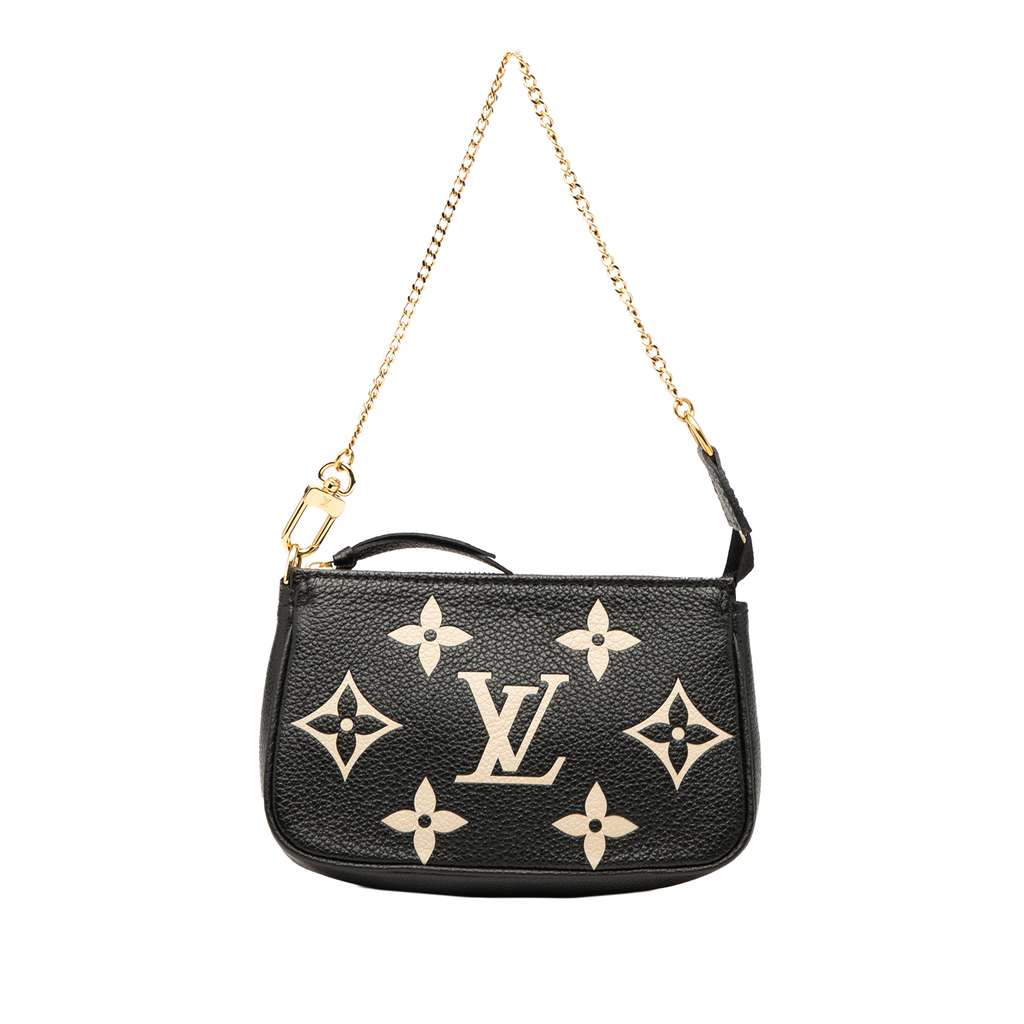The Mini Pochette Accessoires features a monogram empreinte leather body, a gold-tone chain strap, and a top zip closure.