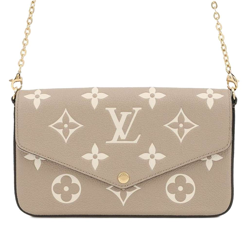 The Pochette Felicie features a monogram empreinte body, a detachable gold-tone chain shoulder strap, a top flap with snap button closure, and an interior zip and slip pouches.