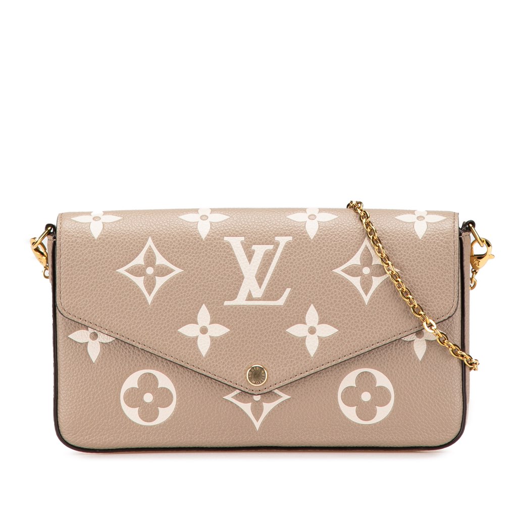 The Pochette Felicie features a monogram empreinte leather body, a detachable chain link shoulder strap, a top flap with a snap button closure, and an interior zip and slip pouches.
