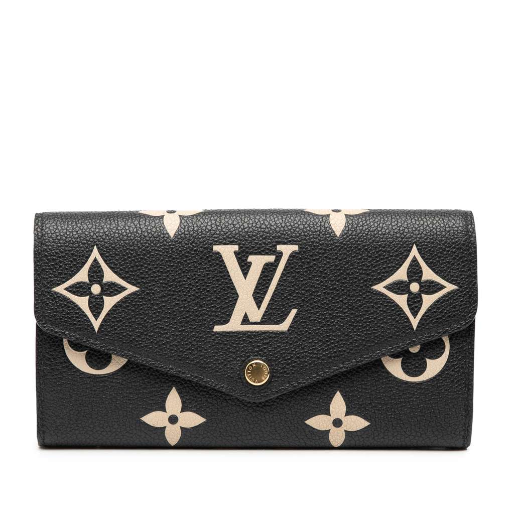The Sarah wallet features a monogram empreinte body, a front flap with snap button closure, and interior zip and slip pockets.
