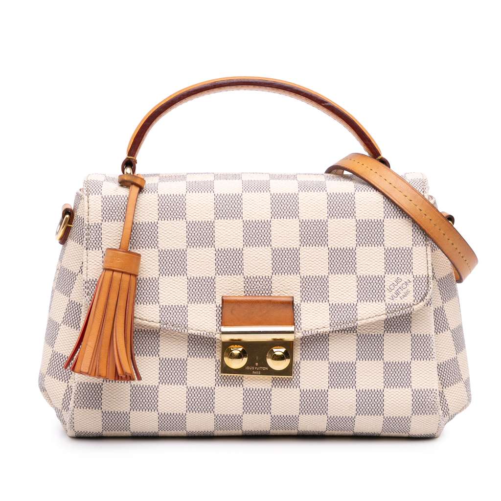 The Croisette features a damier azur canvas body with vachetta leather trim, a leather tassel detail, a flat vachetta leather top handle, a detachable flat vachetta leather strap, a front flap with a gold-tone push-lock closure, and an interior slip pocket.