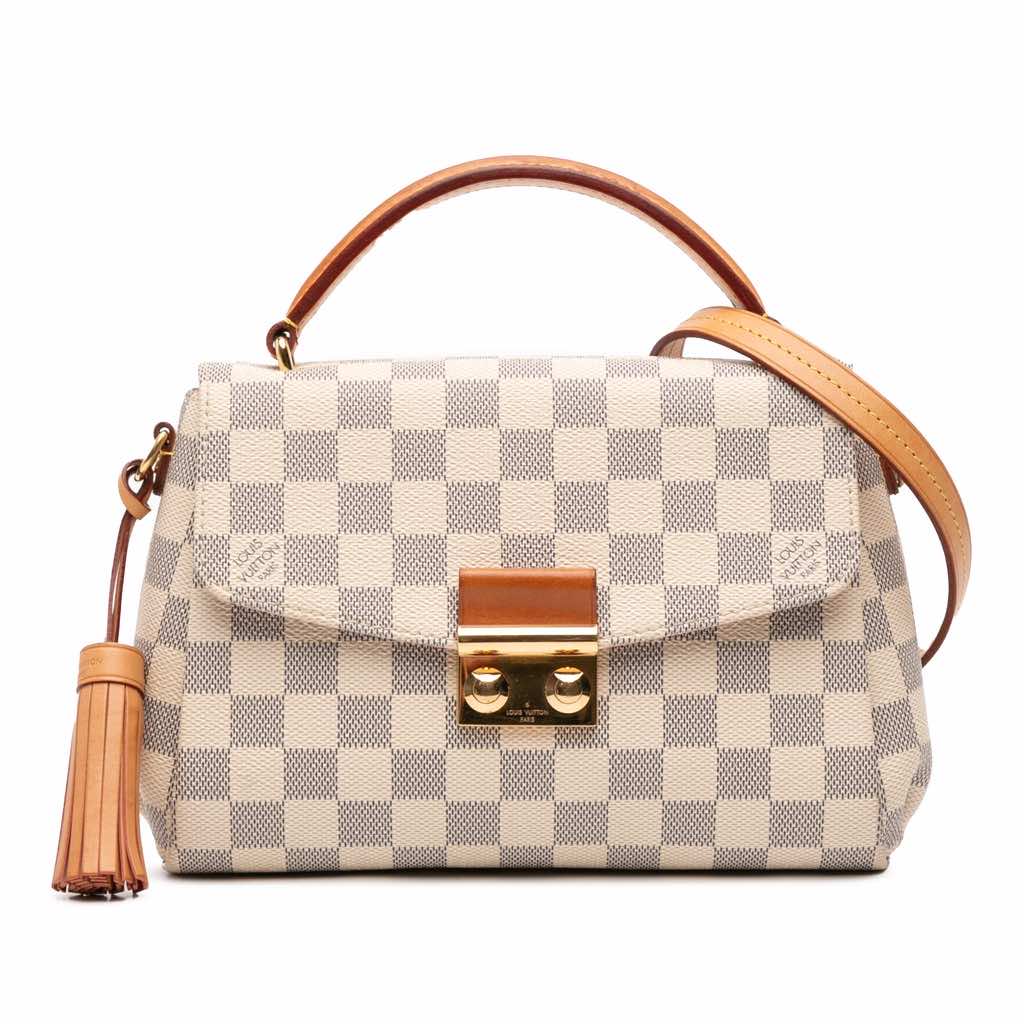 The Croisette features a damier canvas body with vachetta leather trim, a leather tassel detail, a flat vachetta leather top handle, a detachable flat vachetta leather strap, a front flap with a gold-tone push-lock closure, and an interior slip pocket.