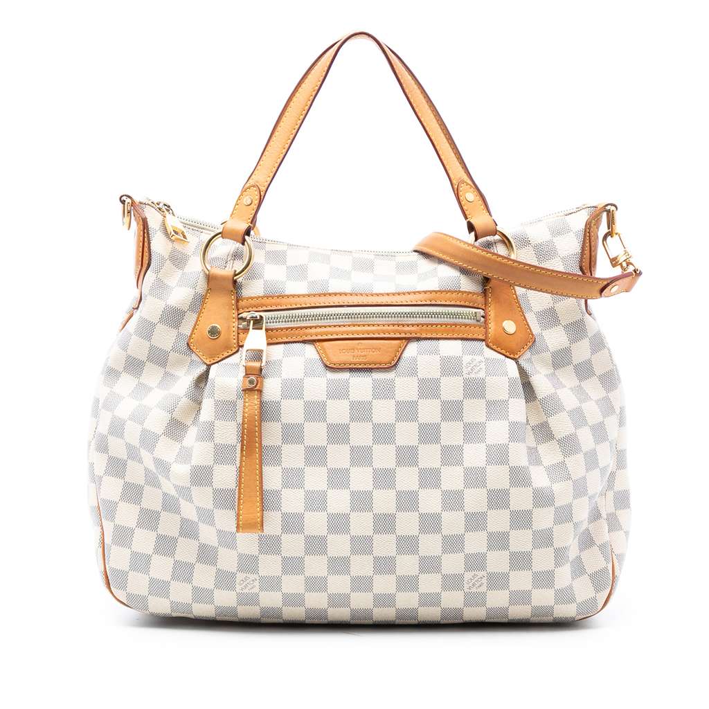 The Evora MM features a damier azur canvas body with vachetta leather trim, flat vachetta leather handles, a detachable flat vachetta leather strap, a top zip closure, an exterior front zip pocket, and interior slip pockets.