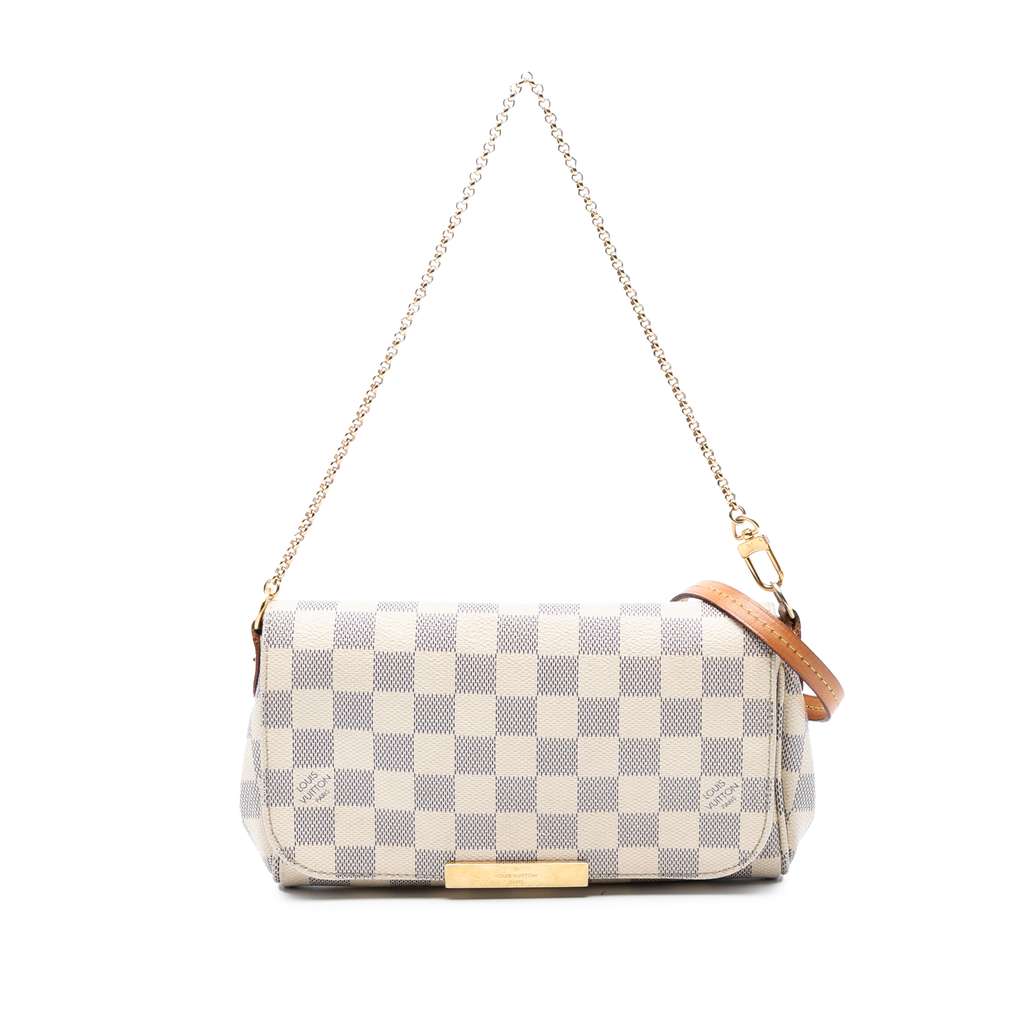 The Favorite PM features a damier azur canvas body, a chain link shoulder strap, a detachable flat vachetta leather strap, a front flap with magnetic closure, and an interior slip pocket.