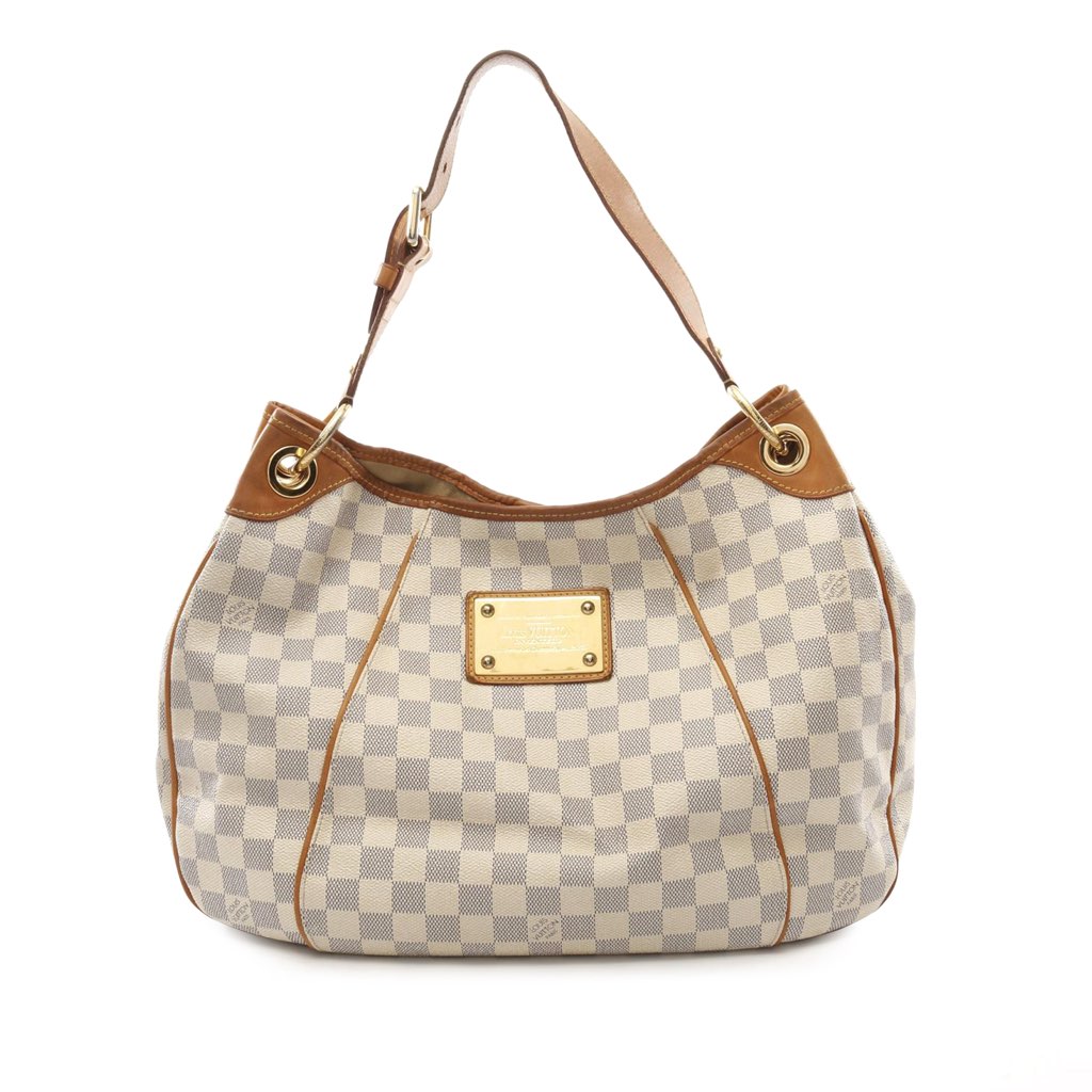 The Galliera PM features a damier azur canvas body with vachetta leather trim, a flat vachetta leather strap, an open top with magnetic snap closure, and interior flap and slip pockets.