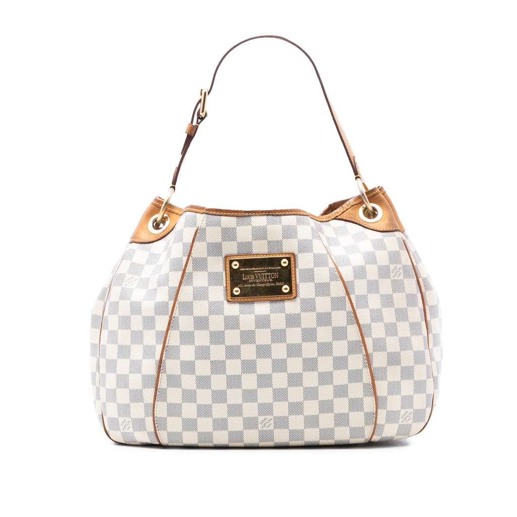 The Galliera PM features a damier azur canvas body with vachetta leather trim, a flat vachetta leather strap, an open top with a magnetic closure, and interior flap and slip pockets.