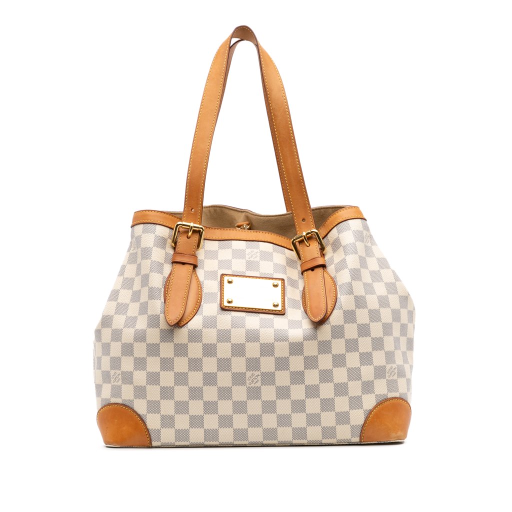 The Hampstead MM features a damier azur canvas body with vachetta leather trim, flat vachetta leather shoulder straps, an open top with a lobster clasp closure, and interior zip and slip pockets.