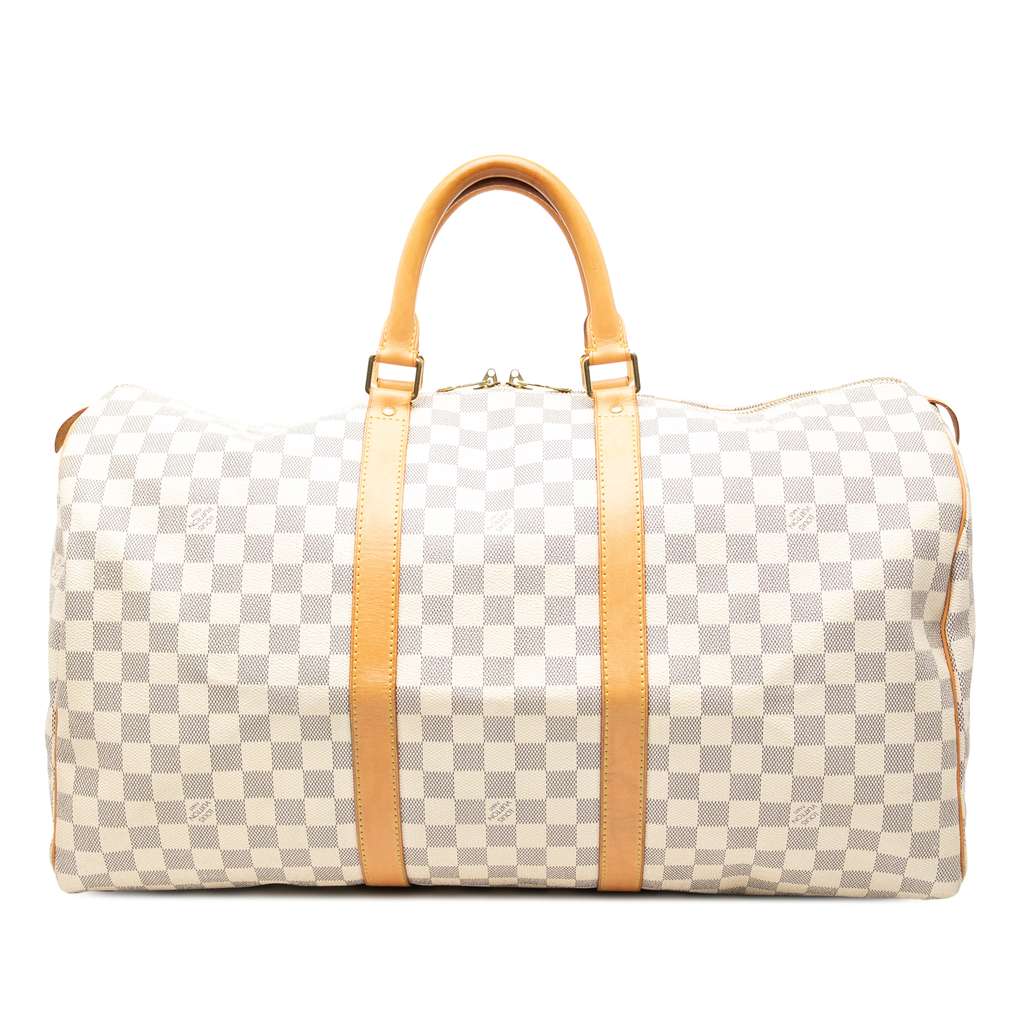 This Keepall 50 features a damier canvas body, rolled vachetta leather handles, and a top zip closure.