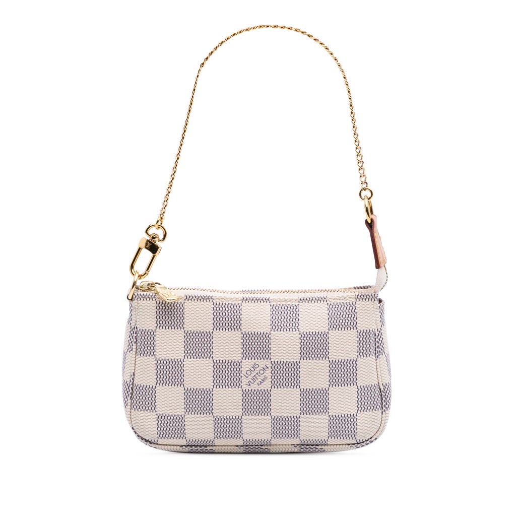 The Mini Pochette Accessoires features a damier azur canvas body, a detachable chain link handle, and a top zip closure.