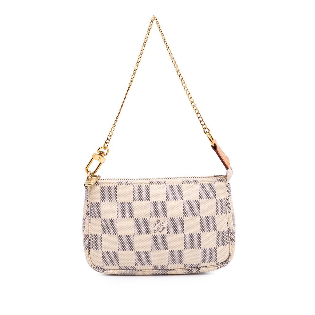 The Mini Pochette Accessoires features a damier azur canvas body, a detachable chain link handle, and a top zip closure.