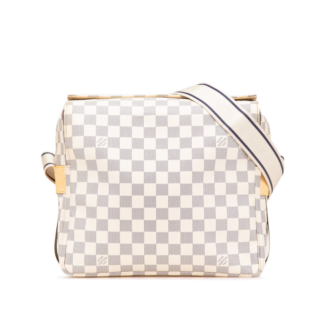 The Naviglio features a damier azur canvas body, an adjustable flat canvas strap, snap and zip top closures, and interior slip pockets.