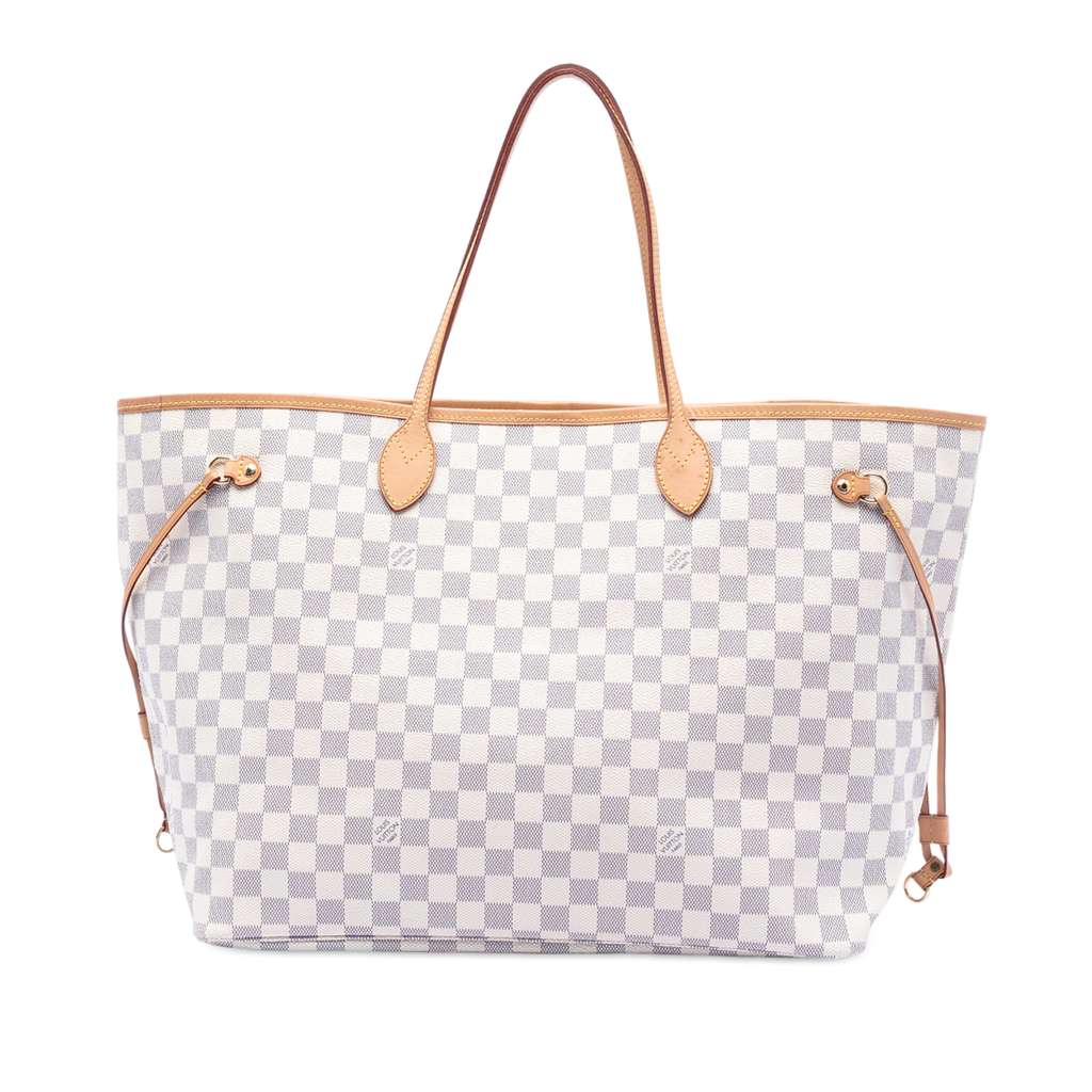 The Neverfull GM features a damier azur canvas body with vachetta leather trim, flat vachetta leather shoulder straps, an open top with lobster hook closure, and an interior zip pocket.