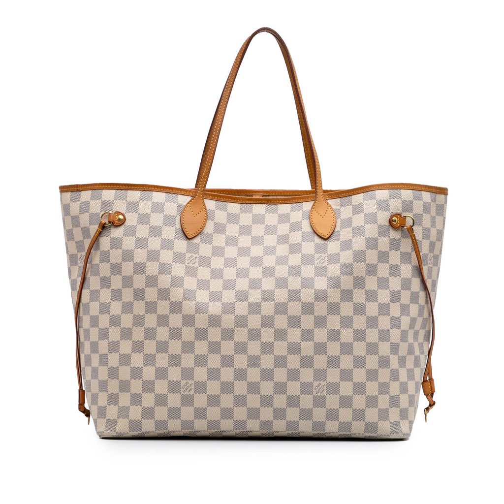 The Neverfull GM features a damier azur canvas body with vachetta leather trim, flat vachetta leather shoulder straps, an open top with lobster claw clasp closure, and an interior zip pocket.