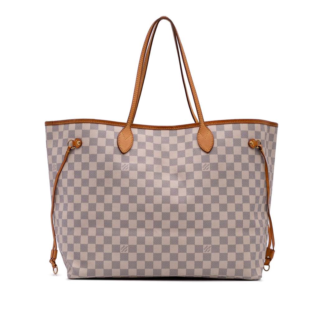 The Neverfull GM features a damier azur canvas body with vachetta leather trim, flat vachetta leather shoulder straps, an open top with a lobster clasp closure, an interior zip pocket, and a pouch inclusion.
