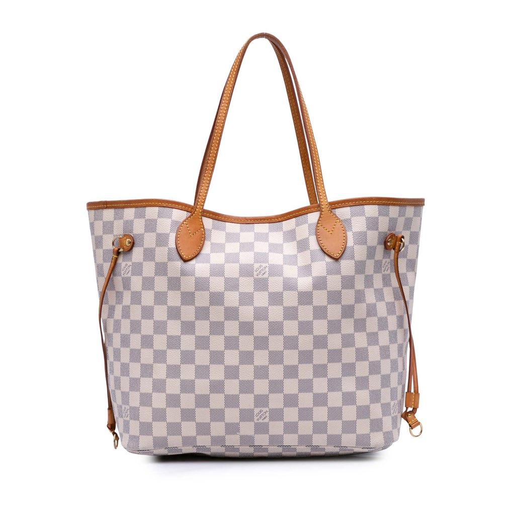 The Neverfull MM features a damier azur canvas body with vachetta leather trim, flat vachetta leather handles, an open top with a lobster clasp closure, and an interior zip pocket.