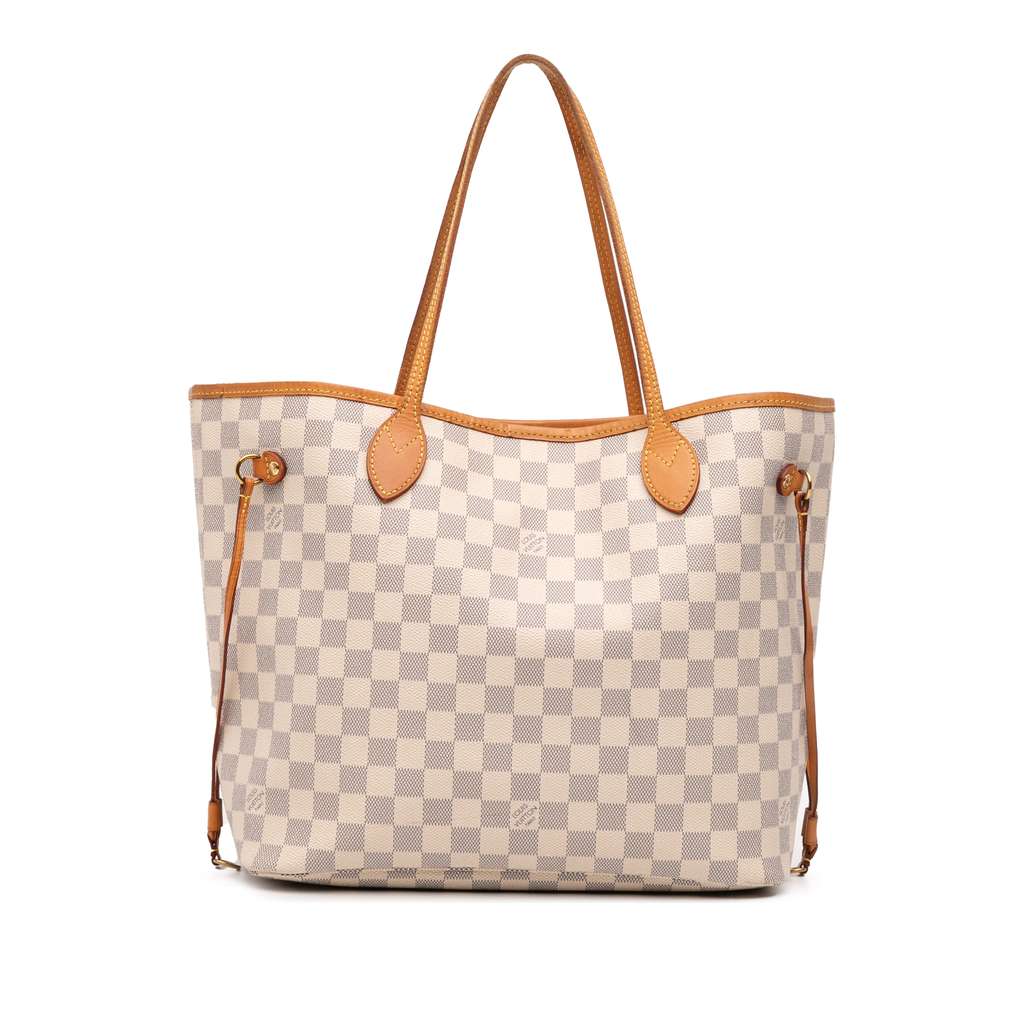 The Neverfull MM features a damier azur canvas body with vachetta leather trim, flat vachetta leather handles, an open top with a lobster clasp closure, and an interior zip pocket.