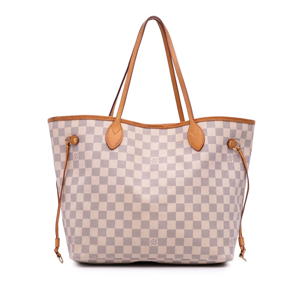The Neverfull MM features a damier azur canvas body with vachetta leather trim, flat vachetta leather handles, an open top with a lobster claw clasp, and an interior zip pocket.