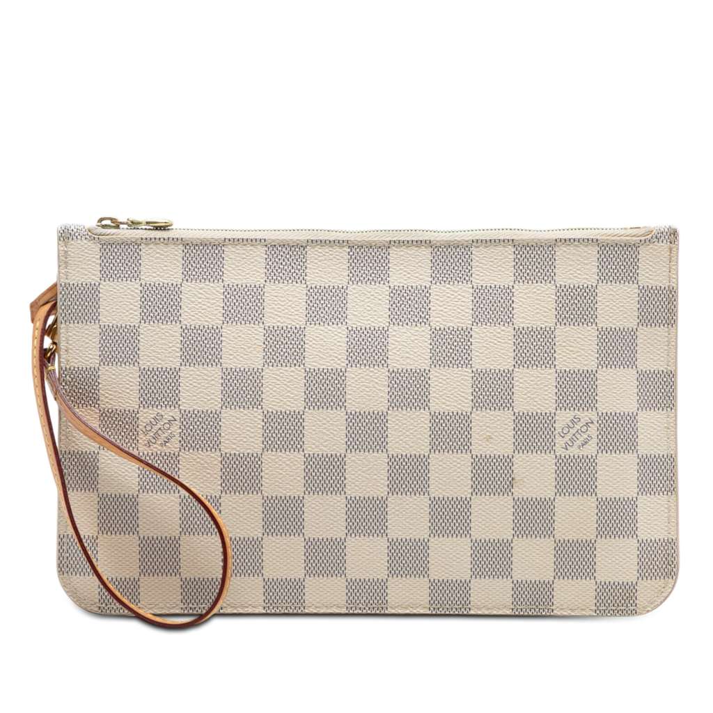 This pouch features a damier canvas body, a flat leather wrist strap, a top zip closure, and an interior slip pocket.