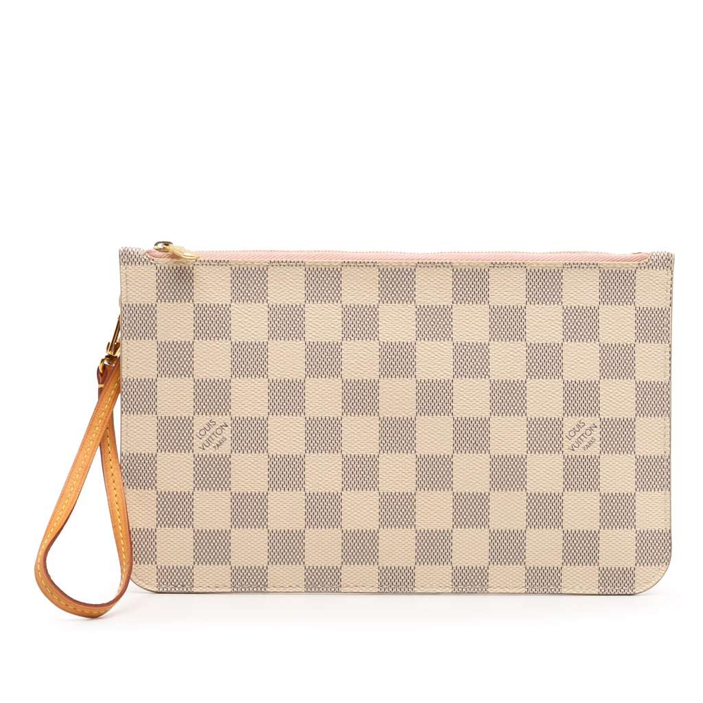 The Neverfull pouch features a damier canvas body, a flat vachetta leather wrist strap, a top zip closure, and an interior slip pocket.