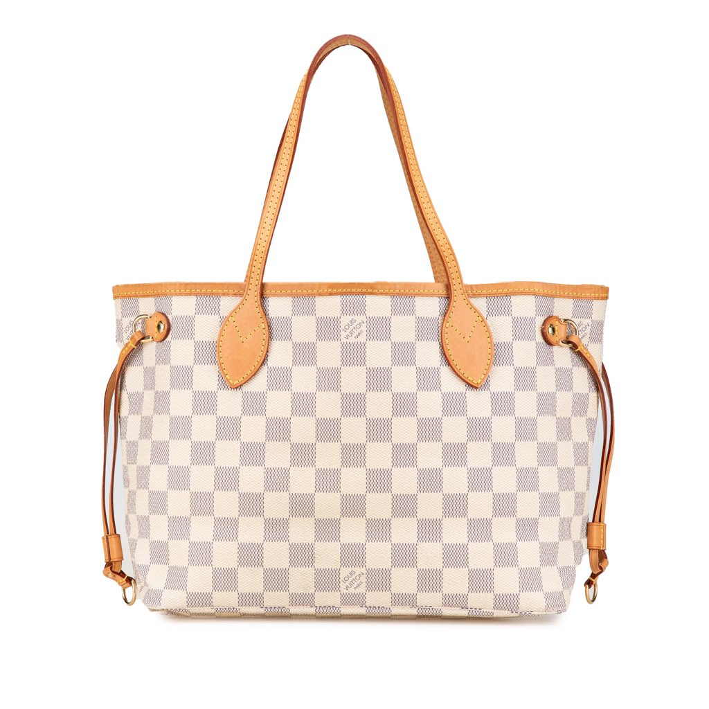 The Neverfull PM features a damier azur canvas body with vachetta leather trim, flat vachetta leather straps, an open top with a lobster clasp closure, and an interior zip pocket.
