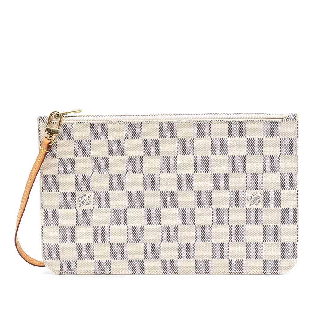 The Neverfull Pochette features a damier azur canvas body, a flat vachetta leather wrist strap, a top zip closure, and an interior slip pocket.