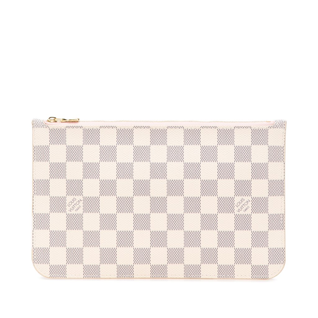 The Neverfull pouch features a damier canvas body, a top zip closure, and an interior slip pocket.