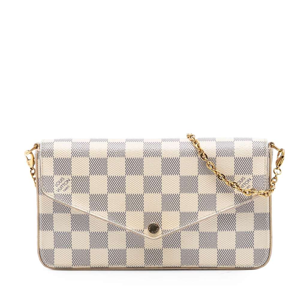 The Pochette Felicie crossbody bag features a damier azur canvas body, a detachable gold-tone chain shoulder strap, a top flap with snap button closure, an interior slip pocket, and a pouch inclusion.