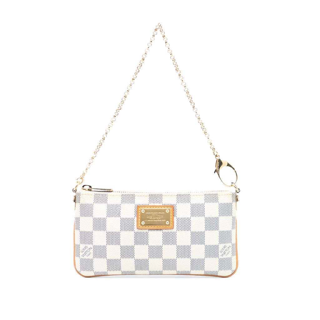 The Pochette Milla MM features a damier azur canvas body with vachetta leather trim, a chain-link handle, a top zip closure, and an interior slip pocket.