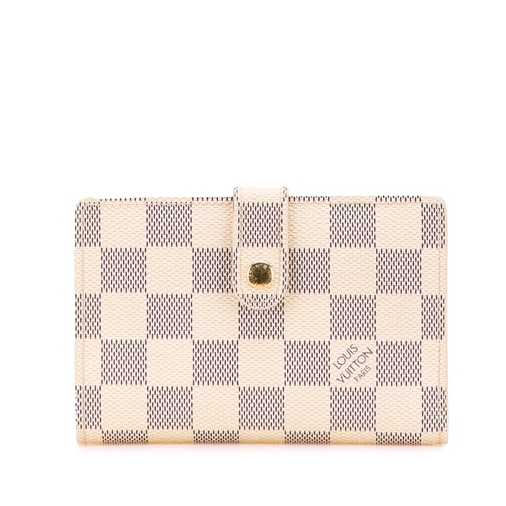 The Viennois features a damier canvas body, a top strap with a snap closure, a coin compartment with a kiss lock closure, and interior slip pockets.