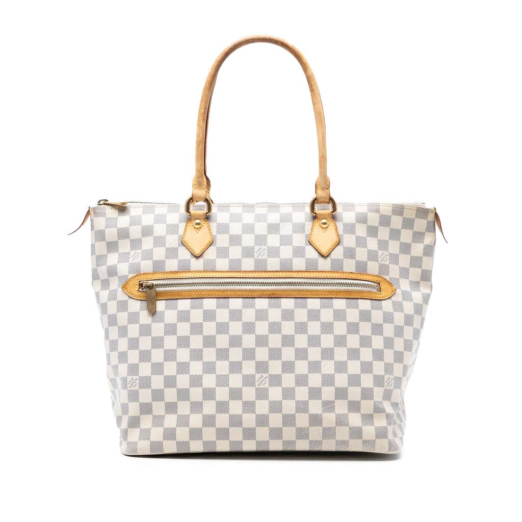 The Saleya GM features a damier azur canvas body with vachetta leather trim, rolled vachetta leather handles, a top zip closure, an exterior front zip pocket, and interior slip pockets.