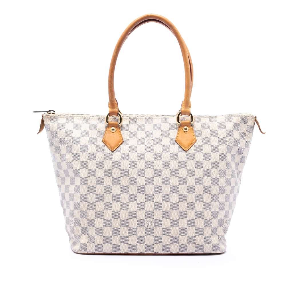 The Saleya MM features a damier azur canvas body, rolled vachetta leather handles, a top zip closure, and interior slip pockets.