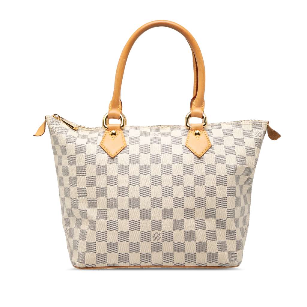 The Saleya PM features a damier azur canvas body, rolled vachetta leather handles, a top zip closure, and interior slip pockets.