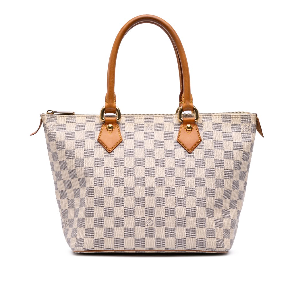 The Saleya PM features a damier azur canvas body, rolled vachetta leather handles, a top zip closure, and interior slip pockets.