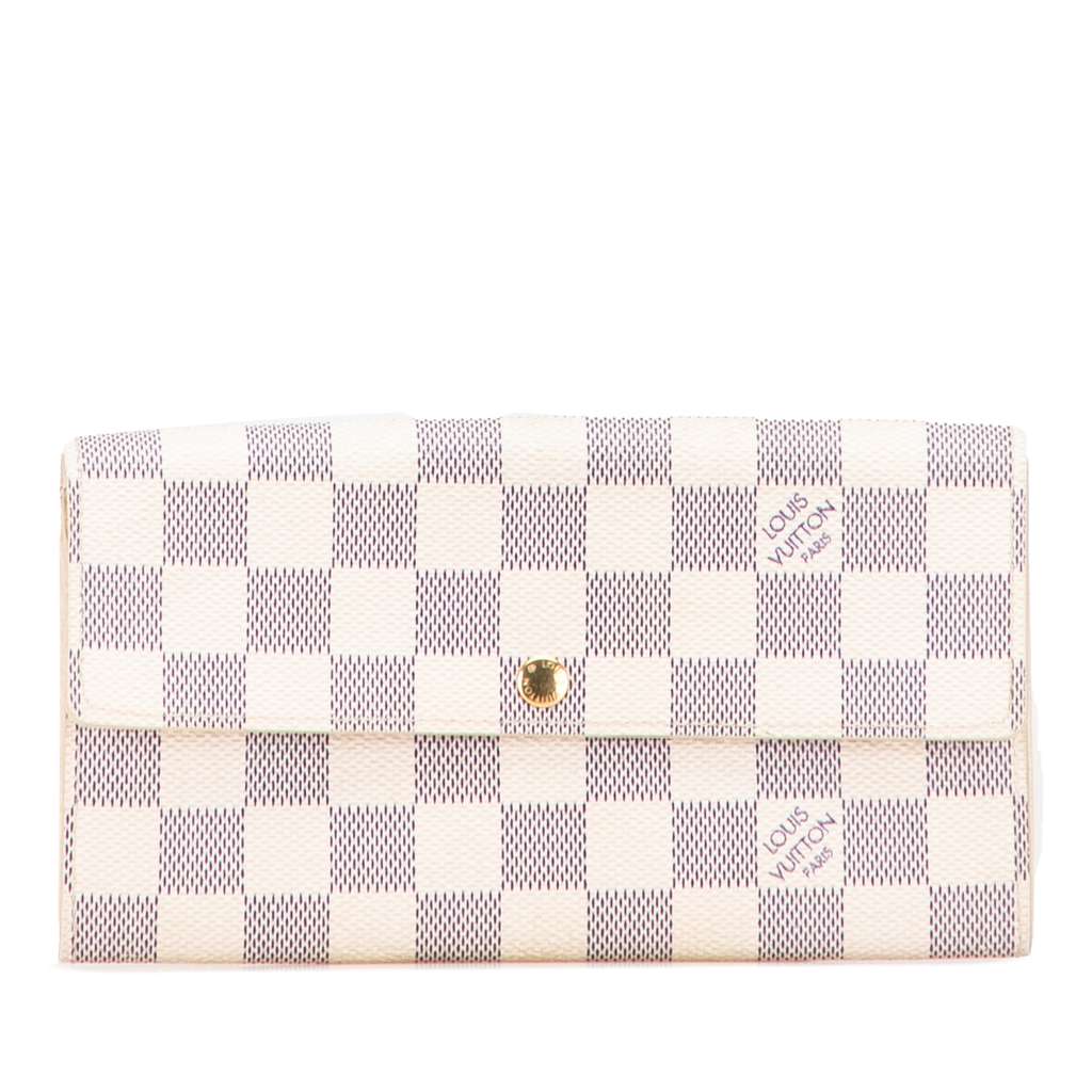 The Sarah Wallet features a damier canvas body, a front flap with button clasp closure, and interior zip and slip compartments