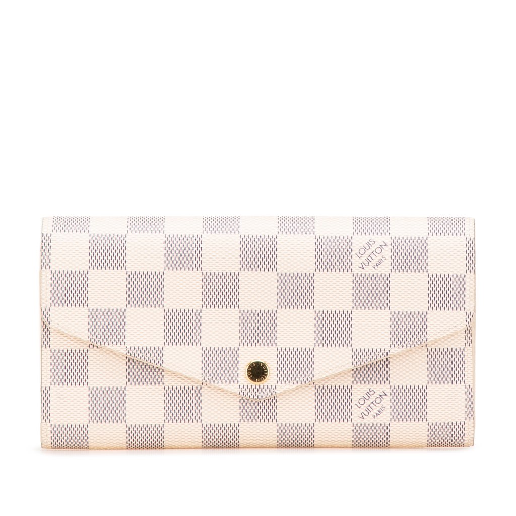 The Sarah Wallet features a damier canvas body, a front flap and button clasp closure, and interior zip and slip compartments.