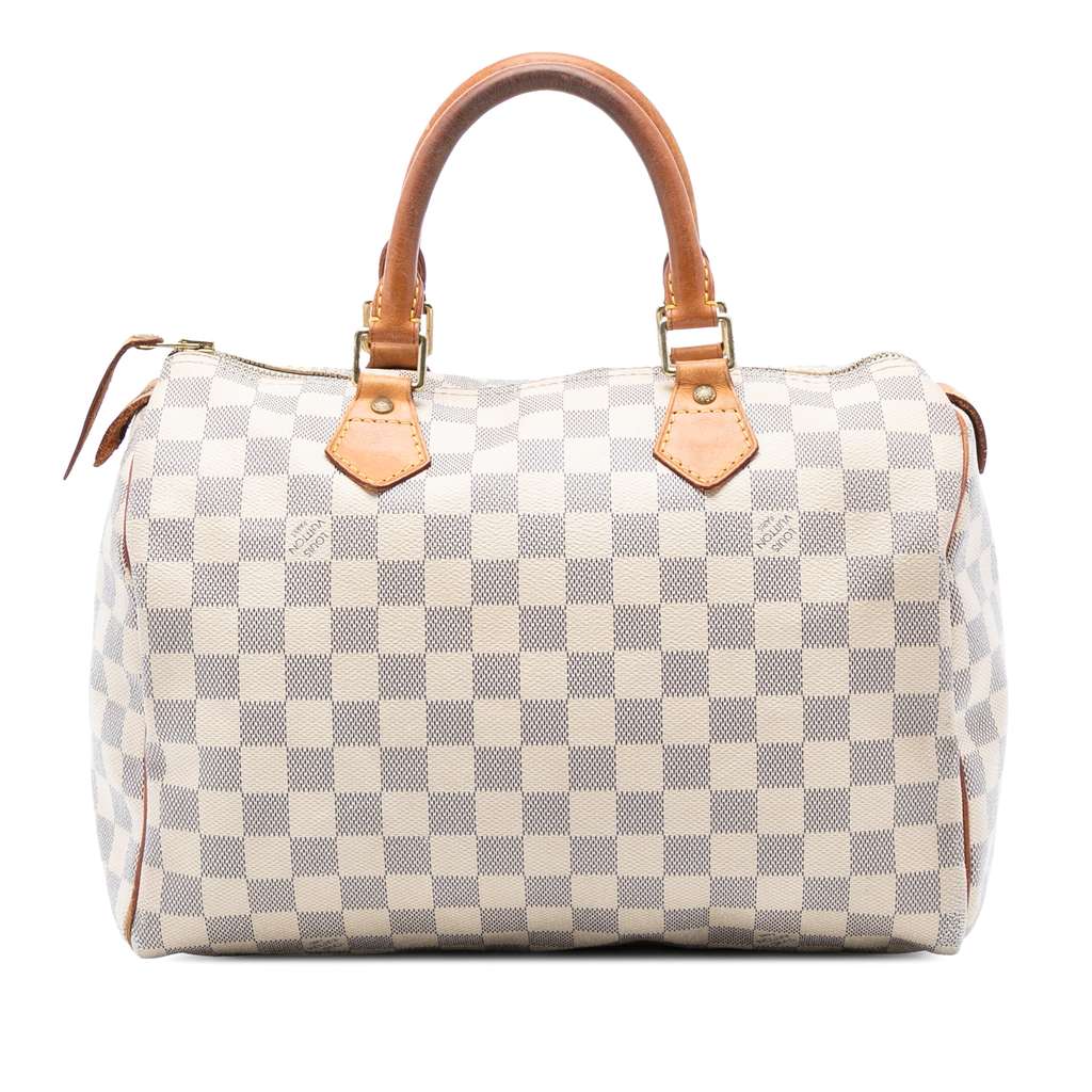 The Speedy 30 features a damier azur canvas body, rolled vachetta leather handles, a top zip closure, and an interior slip pocket.