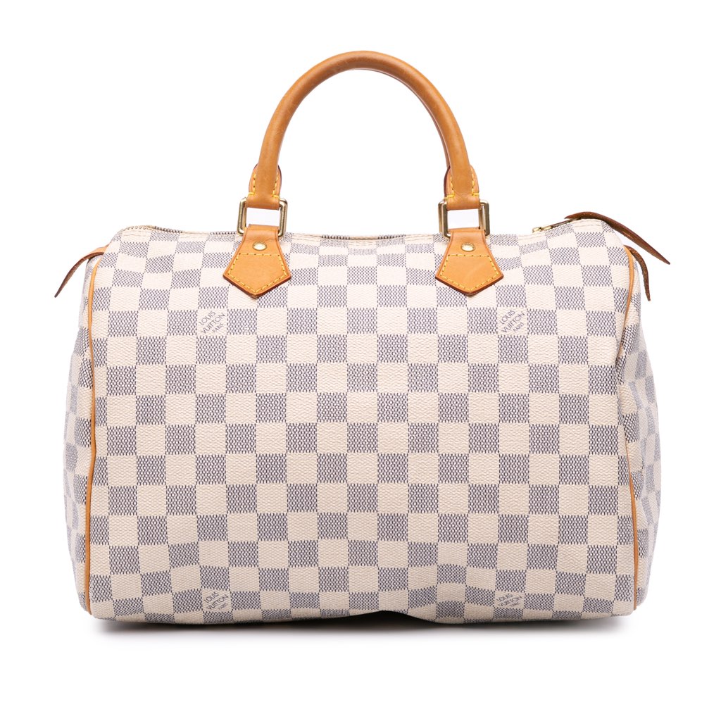 The Speedy 30 features a damier azur canvas body, rolled vachetta leather handles, a top zip closure, and an interior slip pocket.