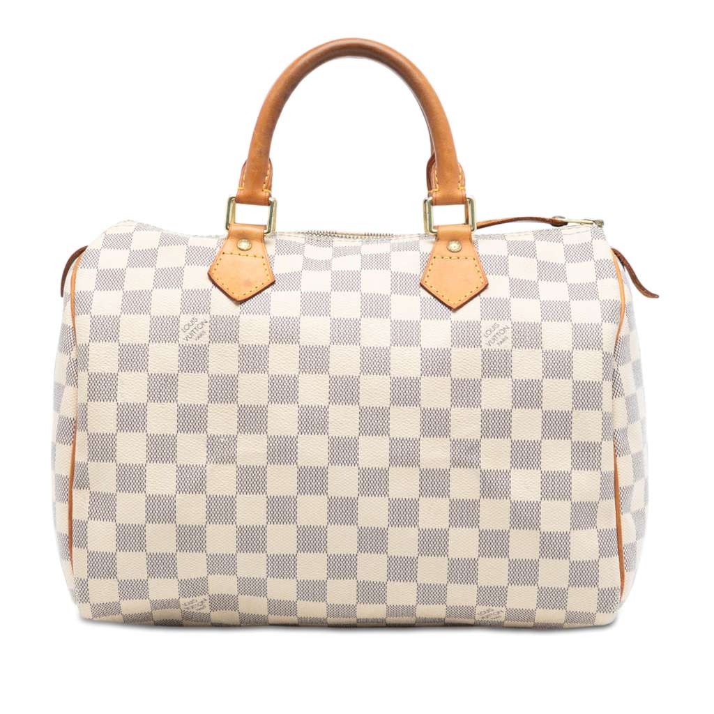 The Speedy 30 features a damier azur canvas body with vachetta leather trim, rolled vachetta leather handles, a top zip closure, and an interior pocket.