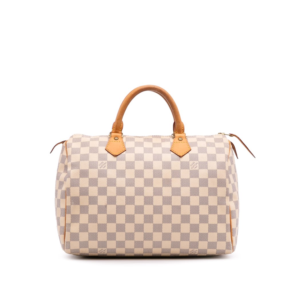 The Speedy 30 features a damier azur canvas body with vachetta leather trim, rolled vachetta leather handles, a top zip closure, and an interior slip pocket.