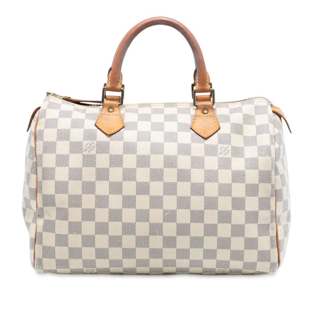 The Speedy 30 features a damier canvas body with vachetta leather trim, rolled vachetta leather handles, a top zip closure, and an interior pocket.