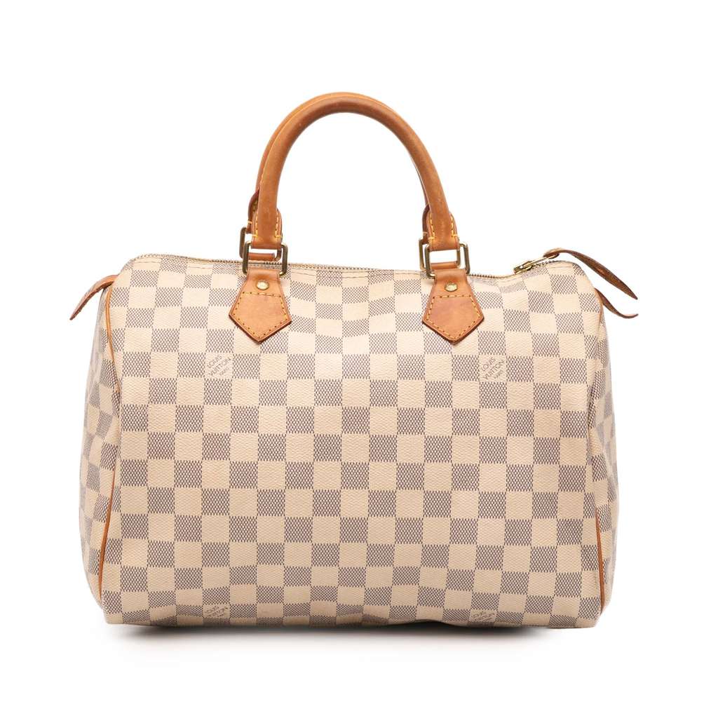 The Speedy 30 features a damier azur canvas body, rolled vachetta leather handles, a top zip closure, and an interior pocket.