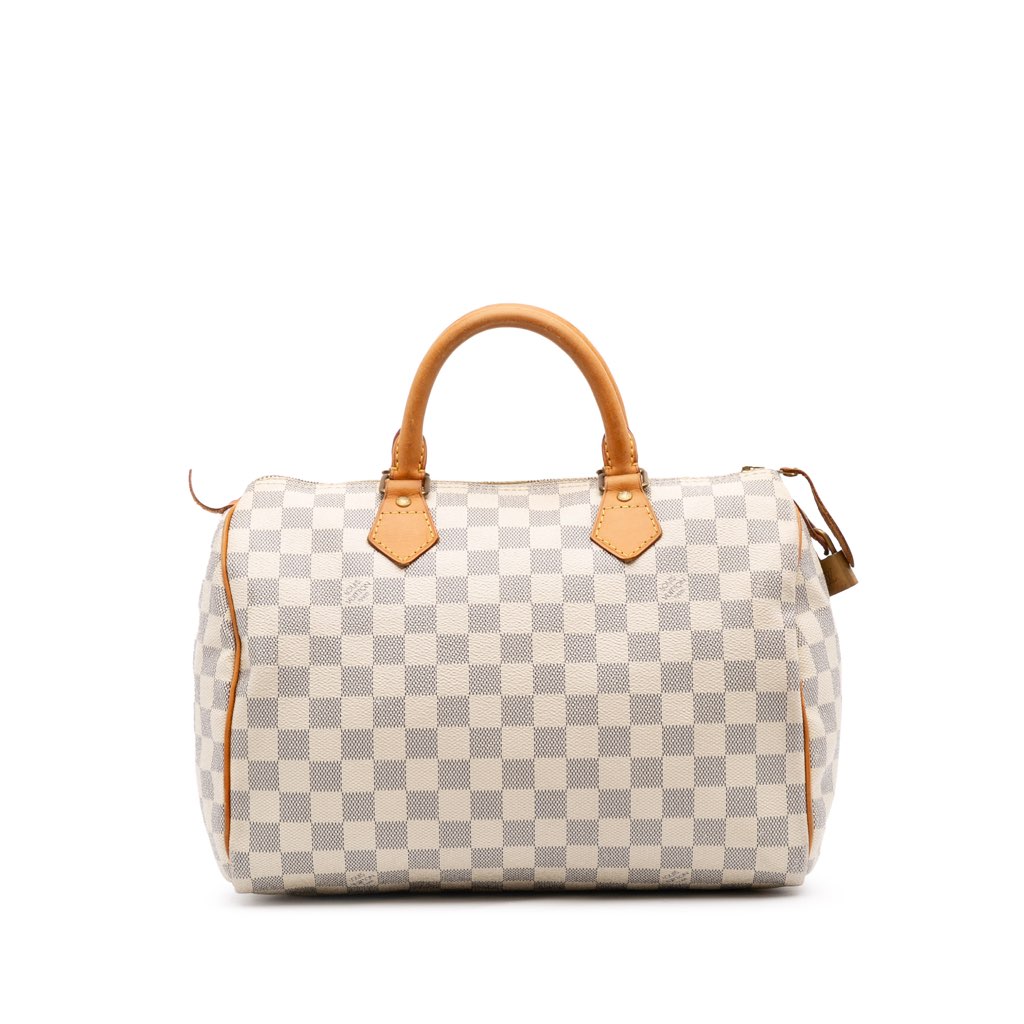 The Speedy 30 features a damier azur canvas body, rolled vachetta leather handles, a top zip closure, and an interior pocket.