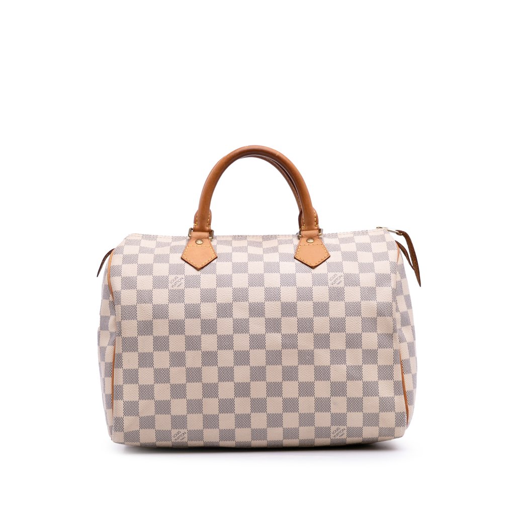 The Speedy 30 features a damier canvas body, rolled vachetta leather handles, a top zip closure, and an interior pocket.