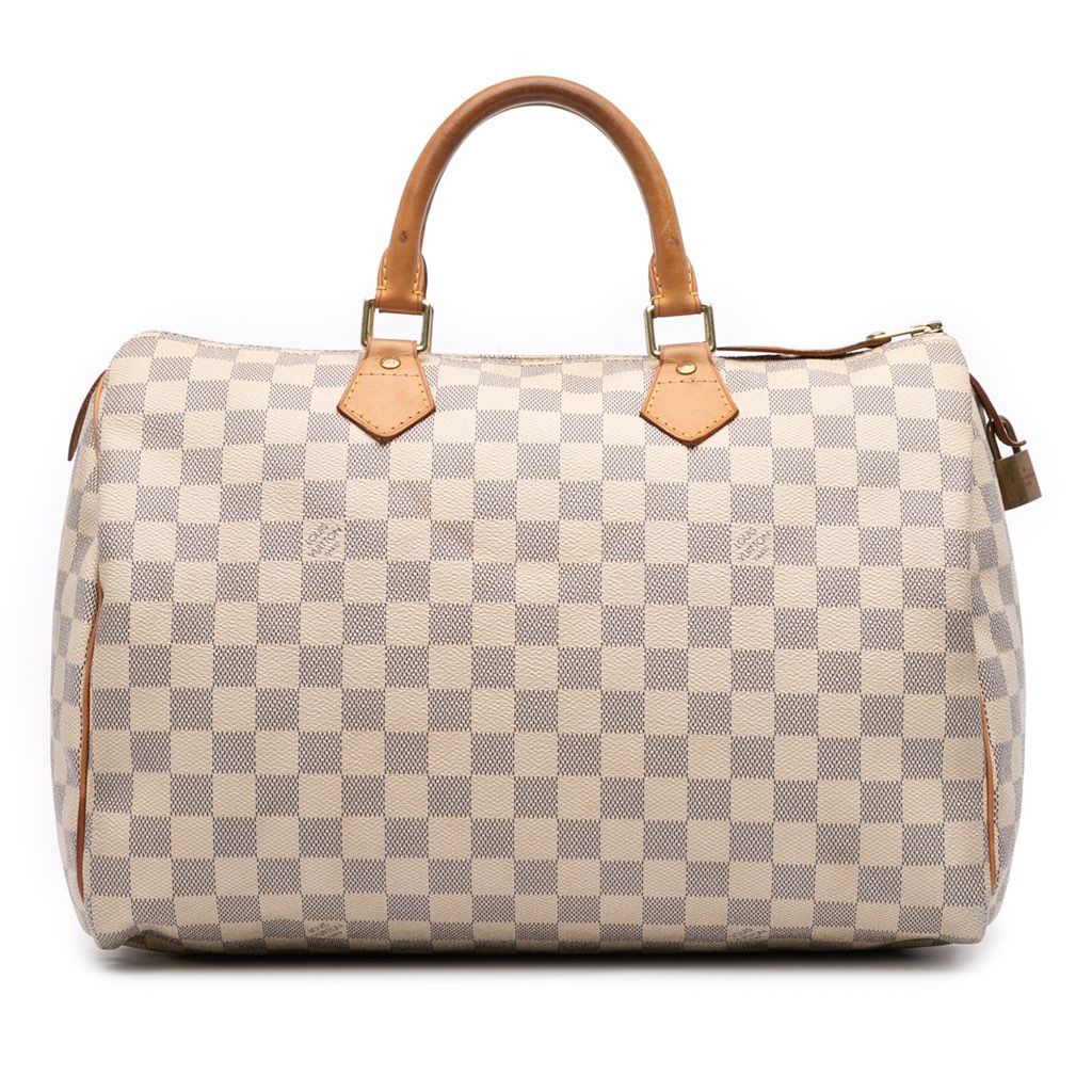 The Speedy 35 features a damier azur canvas body, rolled vachetta leather handles, a top zip closure, and an interior slip pocket.