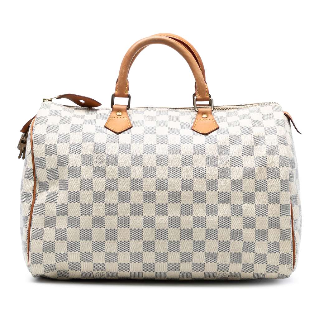 The Speedy 35 features a damier canvas body, rolled vachetta leather handles, a top zip closure, and an interior slip pocket.