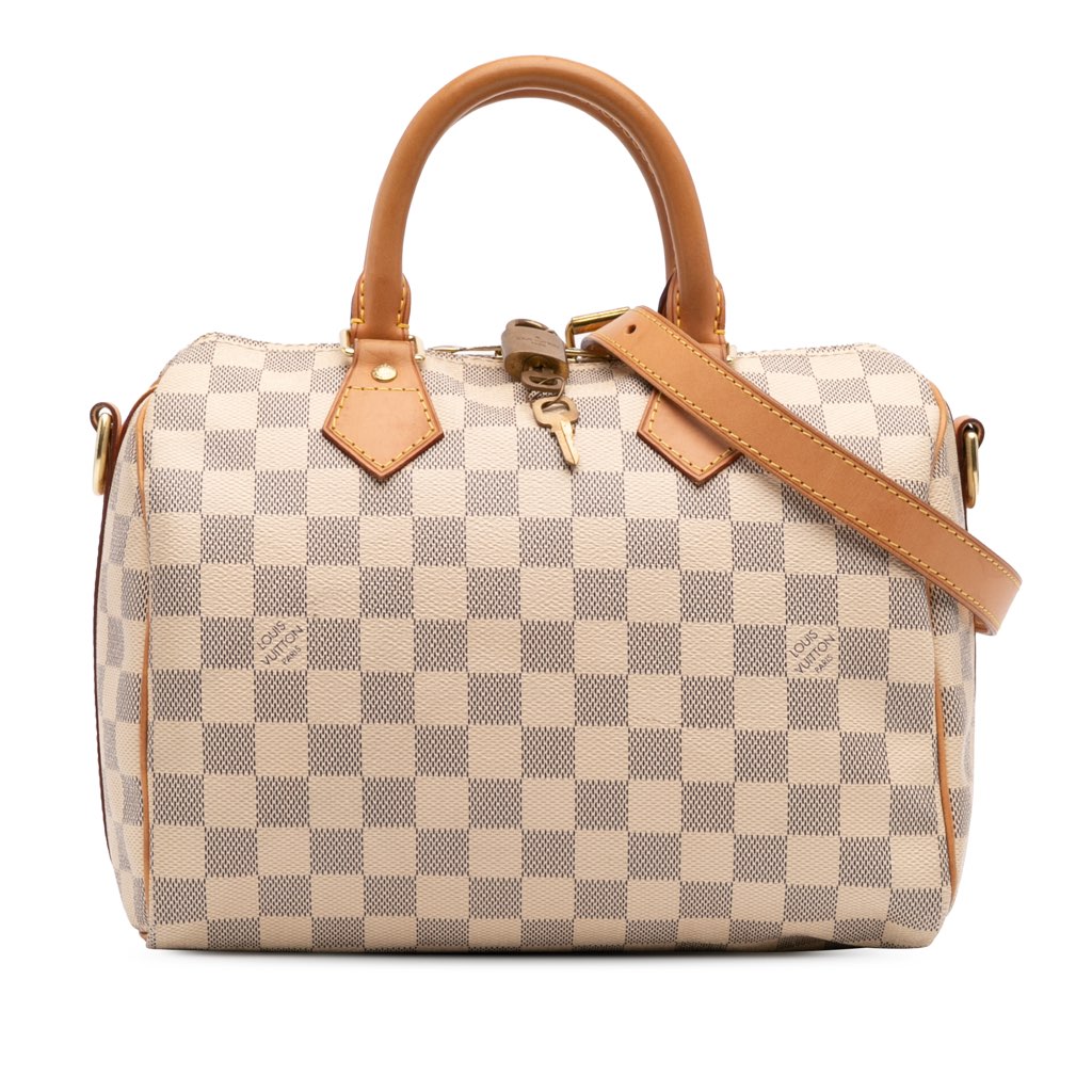 The Speedy Bandouliere 25 features a damier azur canvas body with vachetta leather trim, rolled vachetta leather handles, a detachable and adjustable flat vachetta leather shoulder strap, a top zip closure, and an interior zip pocket.